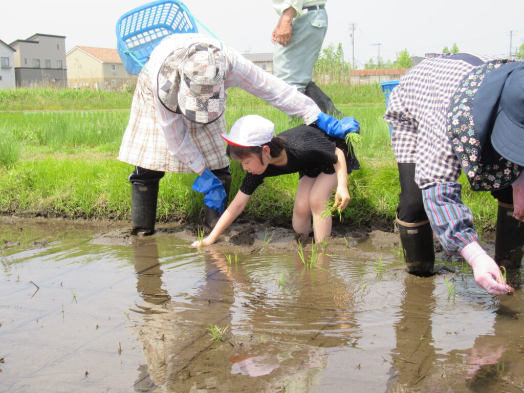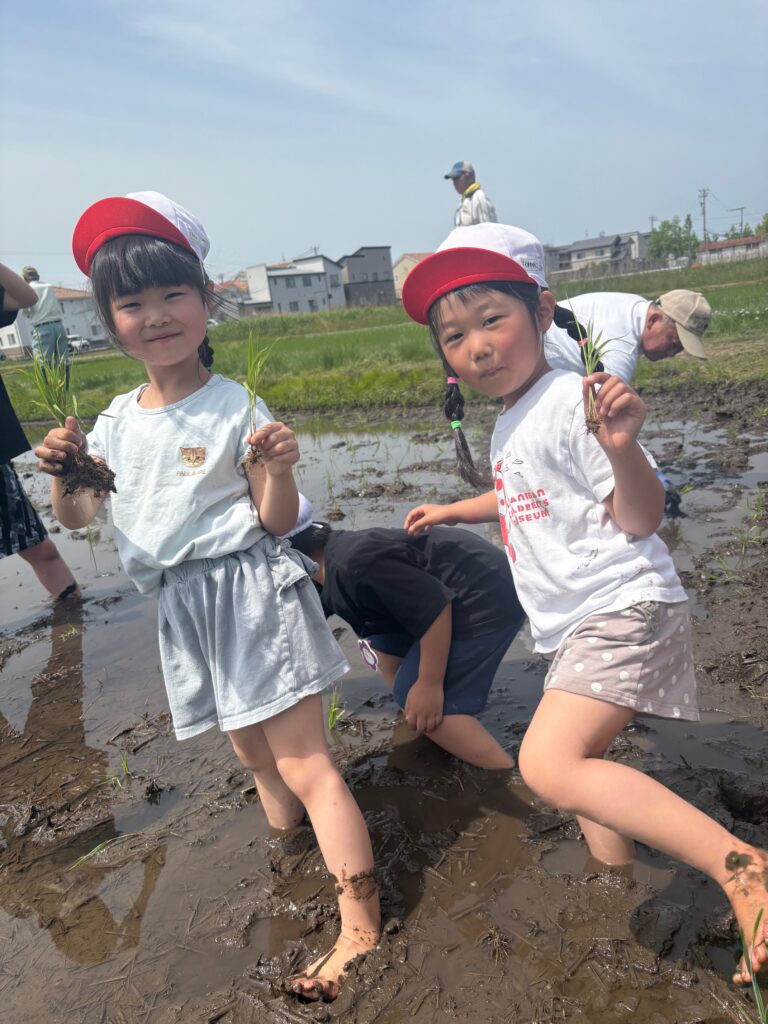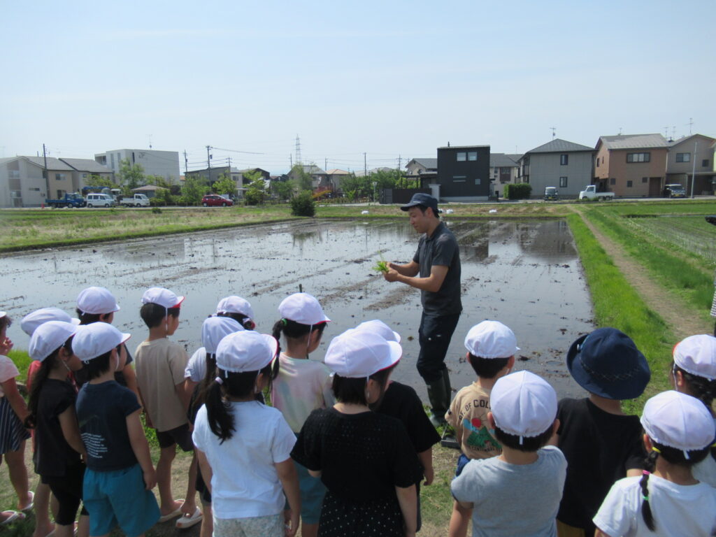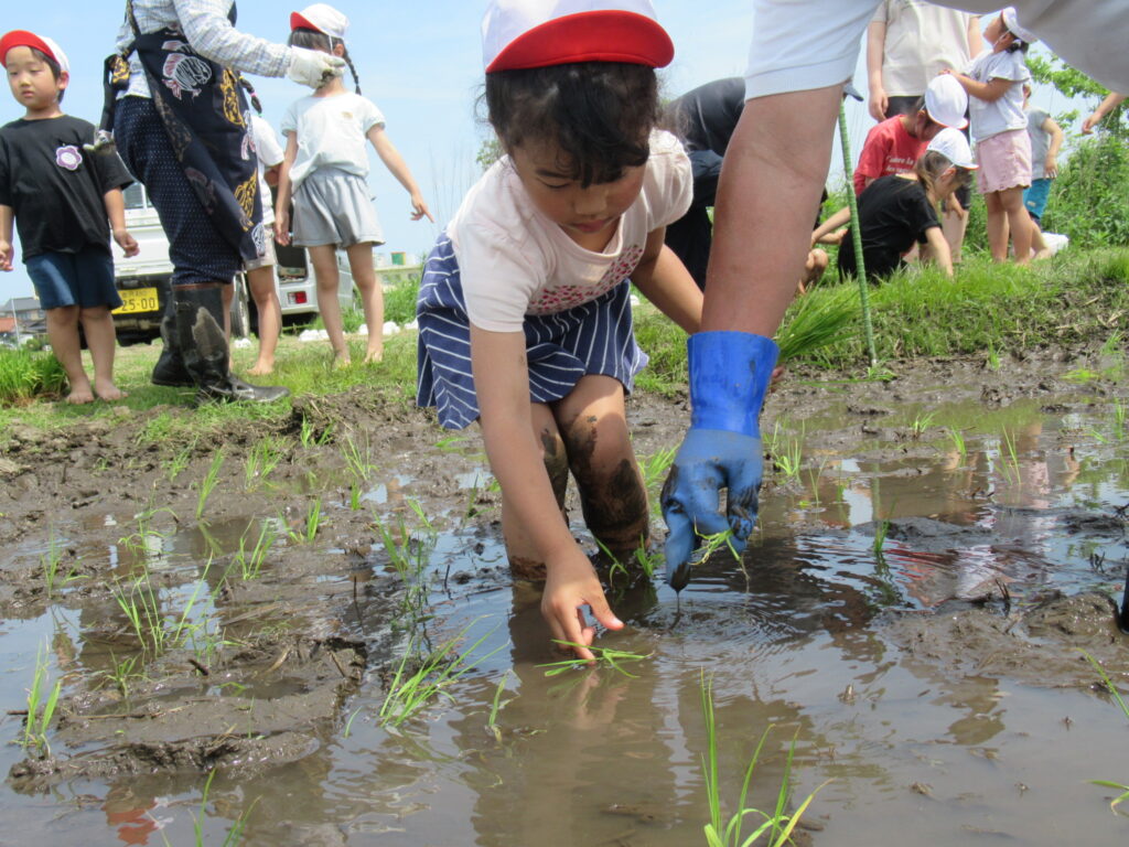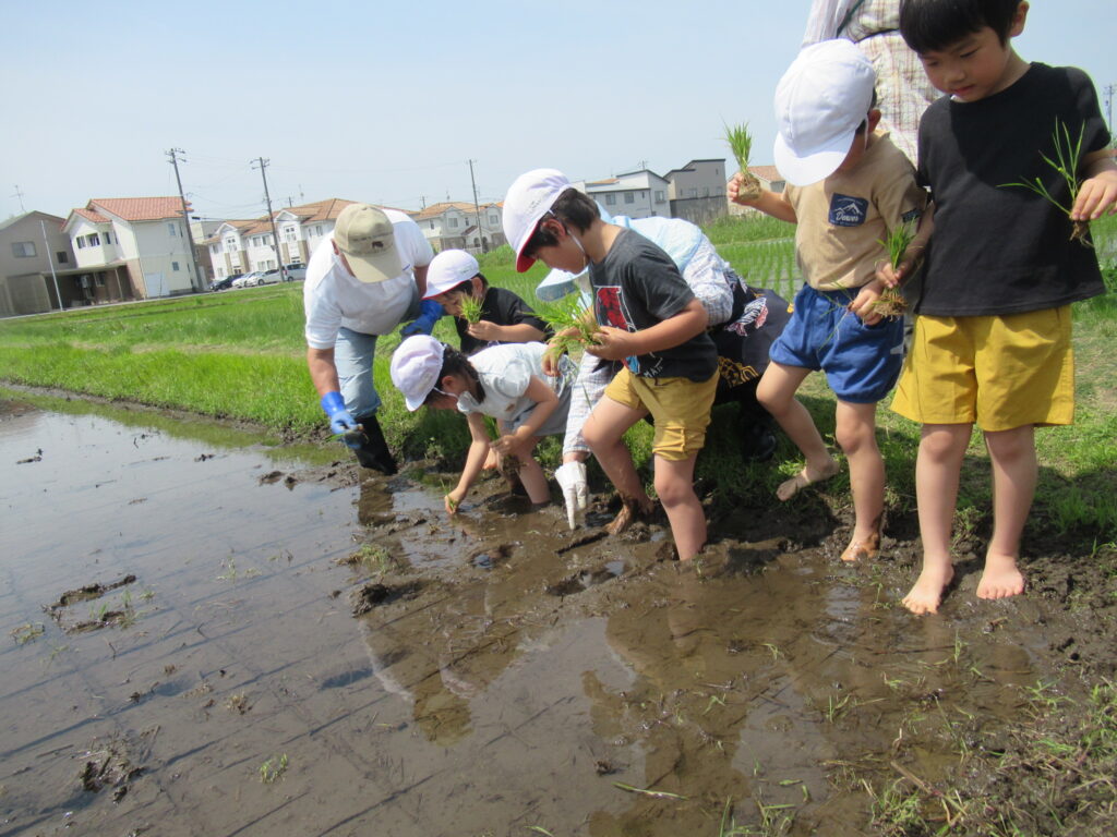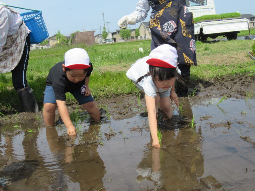 5月21日(水) 地区の方々に植え方を教わり、そーっと苗をつまみ、田んぼに優しく植えました。田んぼに入るときは、何だか気持ち悪く感じたが、入ってしまえば土が冷たく気持ちよく感じたようです。「足が田んぼから抜けないよー!!」「こけそうー!!」「キャーキャー」言いながら、苦戦しながら田植えを終えました。「秋になったら稲刈りして早く食べたいなー」「おにぎり作ってたべよー」「カレーライスにして食べたい!!」と稲刈りや収穫も期待している様子がありました。
