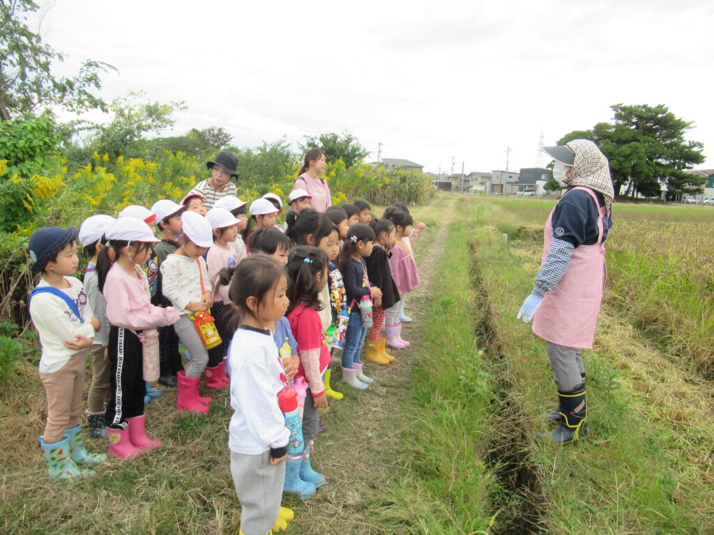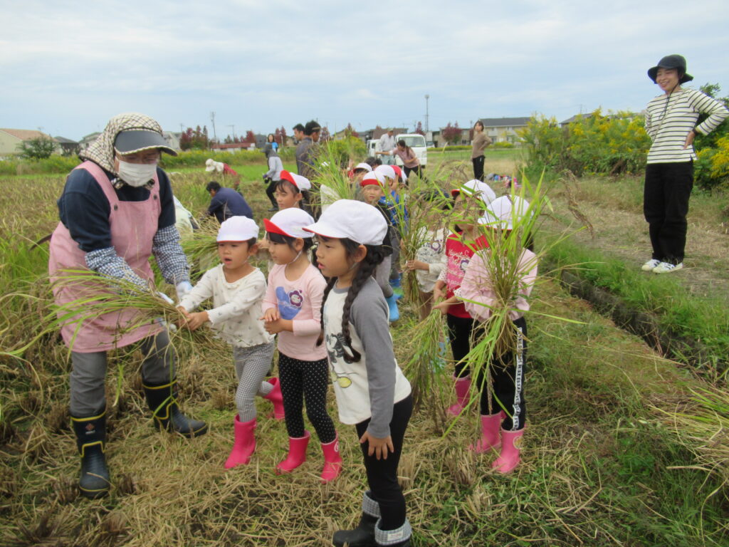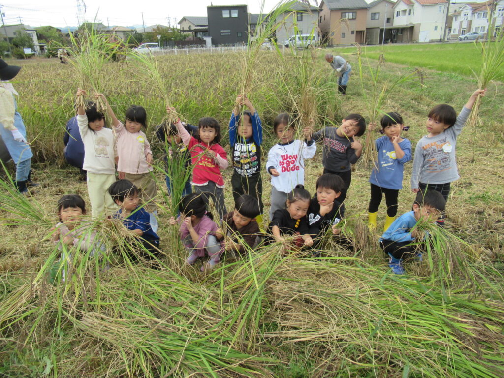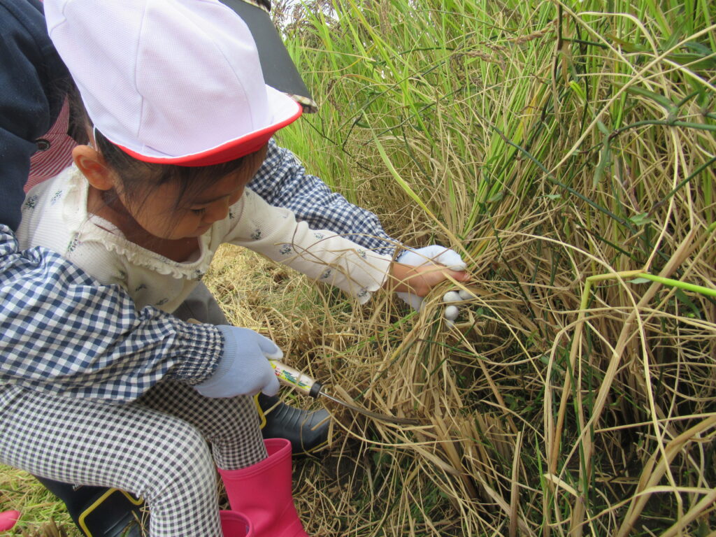 お知らせ 2024.11.21 10月22日(火)初めての稲刈り。なかなか刈り取りができなかった。教えていただいて、手伝ってもらって何とか刈り取ることができました。 「カマのどっちが切れるの?わかんない!切れない!アッ! 切れた! 切れた!」少し稲をつかんで切ると上手くいったようです。初めての経験だったので、みんな楽しく刈り取っていました。「かゆい!かゆい!」と言いながらも沢山刈り取っていた園児もいました。