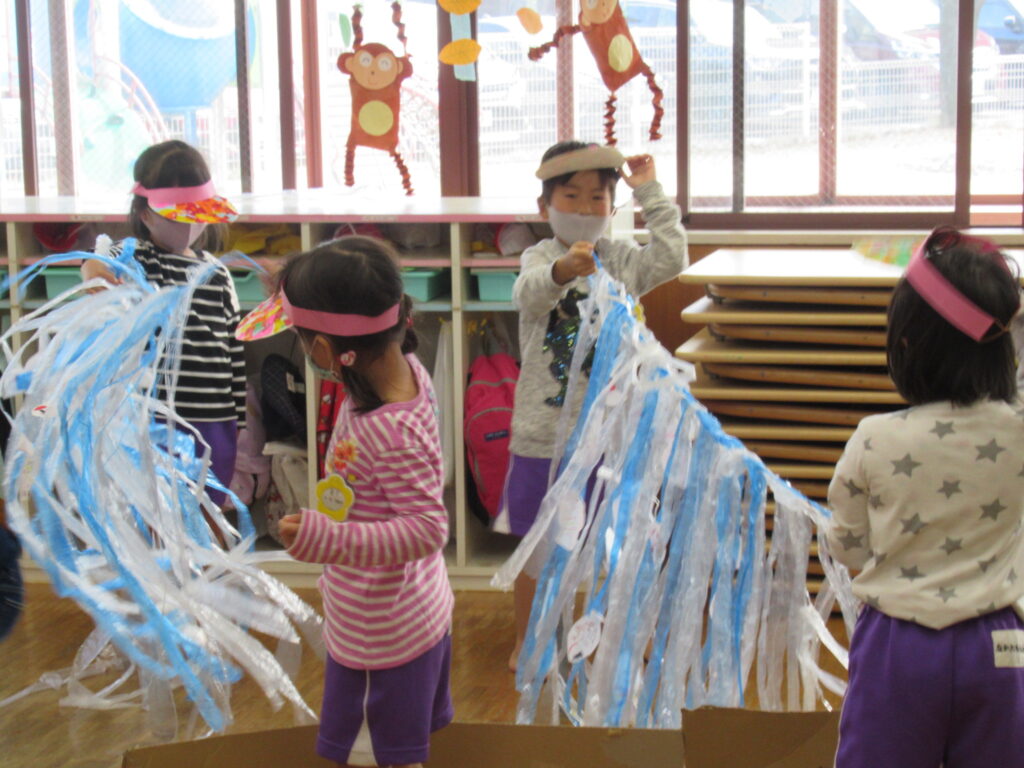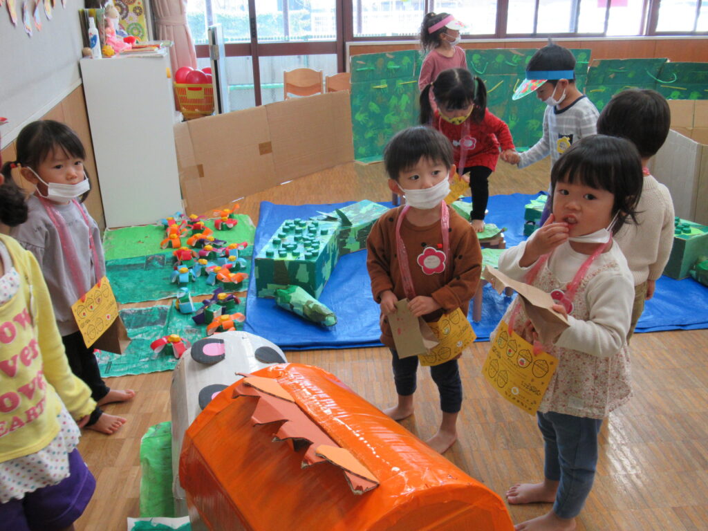 子ども達と話し合い、「ジャングル」をテーマに遊びの広場を展開していきました。当日はそれぞれのお仕事をしっかりとこなすことができました。お客さんがたくさん来てくれ、楽しかった!と言ってもらえて大成功!!友達と協力して同じことに取り組むことの楽しさをかんじることができました。