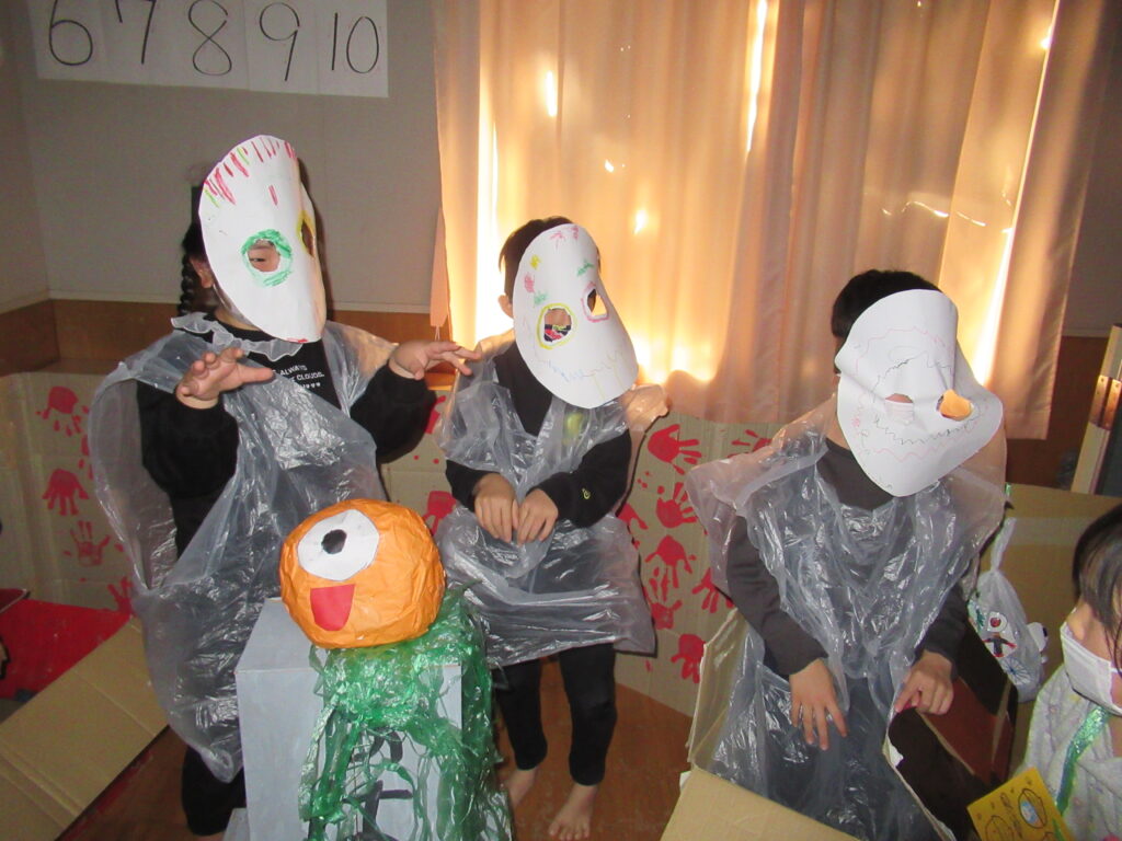 「おばけやしきやりたい!」と毎年恒例になっている年長組さんのおばけやしき。お化けの種類も子ども達で考えました。道は迷路みたいに障害物もあったり、隠れて驚かす場所も作りました。「ここに箱を置いて、合図するからきたら箱から出ておどろかすよ!」「小さい子には優しくしよう」みんなで工夫したおばけやしき。最後はみんなで作ったガイコツキーホルダーをおみやげにプレゼント。「近づかないで~!」と怖がるお友だちもいて、おばけやしきは大成功でした!