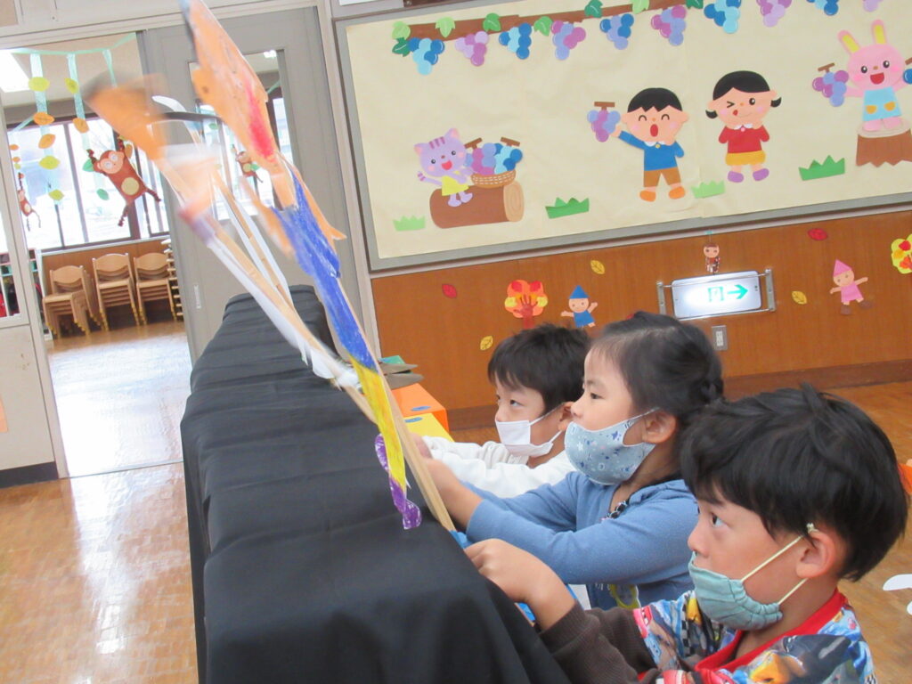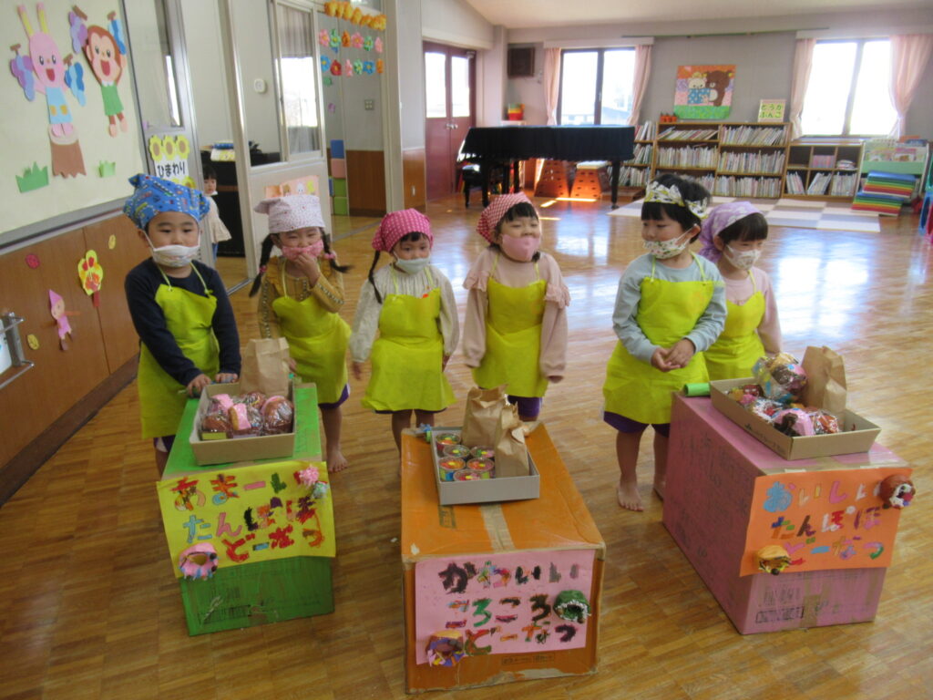 11月15日~11月18日まで、全園児によるおたのしみデイがありました。この活動は、自分達で考え、グループで活動し、その中で役割りを決め責任を持って取り組む内容や、大きい子が、小さい子に昔ながらの遊びを伝承するなど異年齢との交流を大切にする活動です。コロナウイルス感染症による新生活様式のため、制限がある中で当日を迎えるまでに毎日工夫したり自分自身や仲間との意見を取り入れながら準備を進めてきました…。