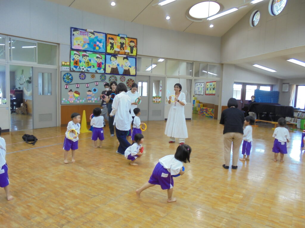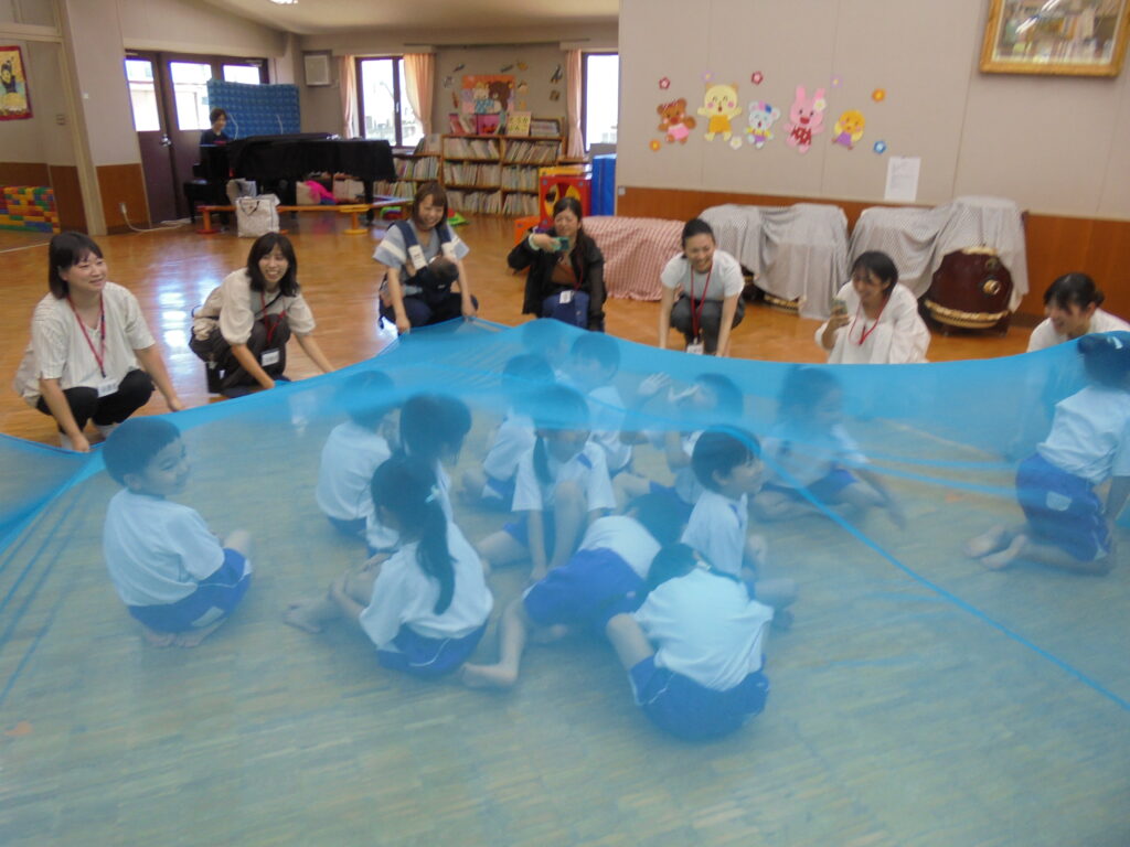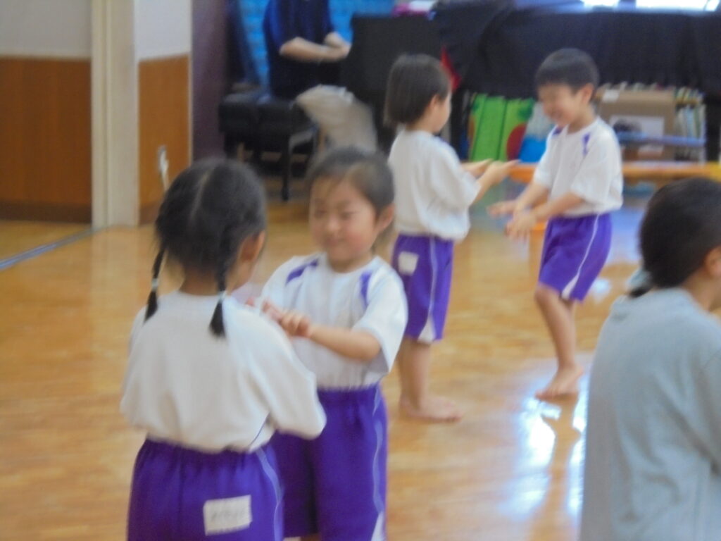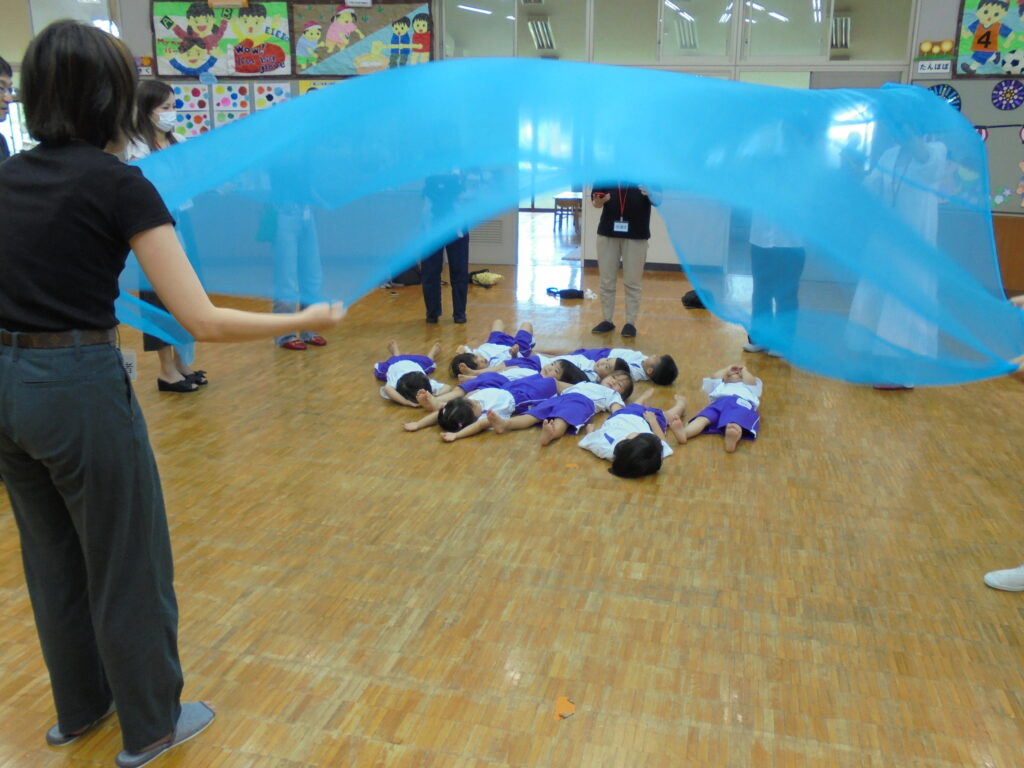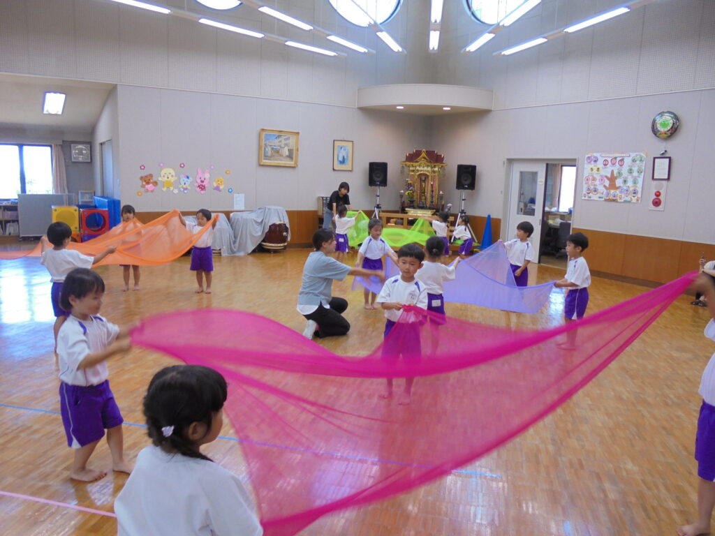 えんだより 2024.07.11 7月「リトミック教室」保護者に公開 7月5日(金)年少・年中・年長組の順でリトミック教室の公開をしました。 「海」をテーマとした動きとリズムを取り入れ、楽しく保護者と共にリトミック教室を展開してみました。ブルーやピンク、オレンジ色のカーテンを使った「海」「波」の音で子どもたちは思わず「へー!!すごい!本当の音みたい! すごい!すごい!」 「ママも海に入って、パパも入って」などと歓声を上げ、親子一つになり「海」を表現していました。