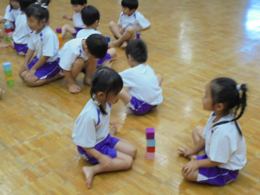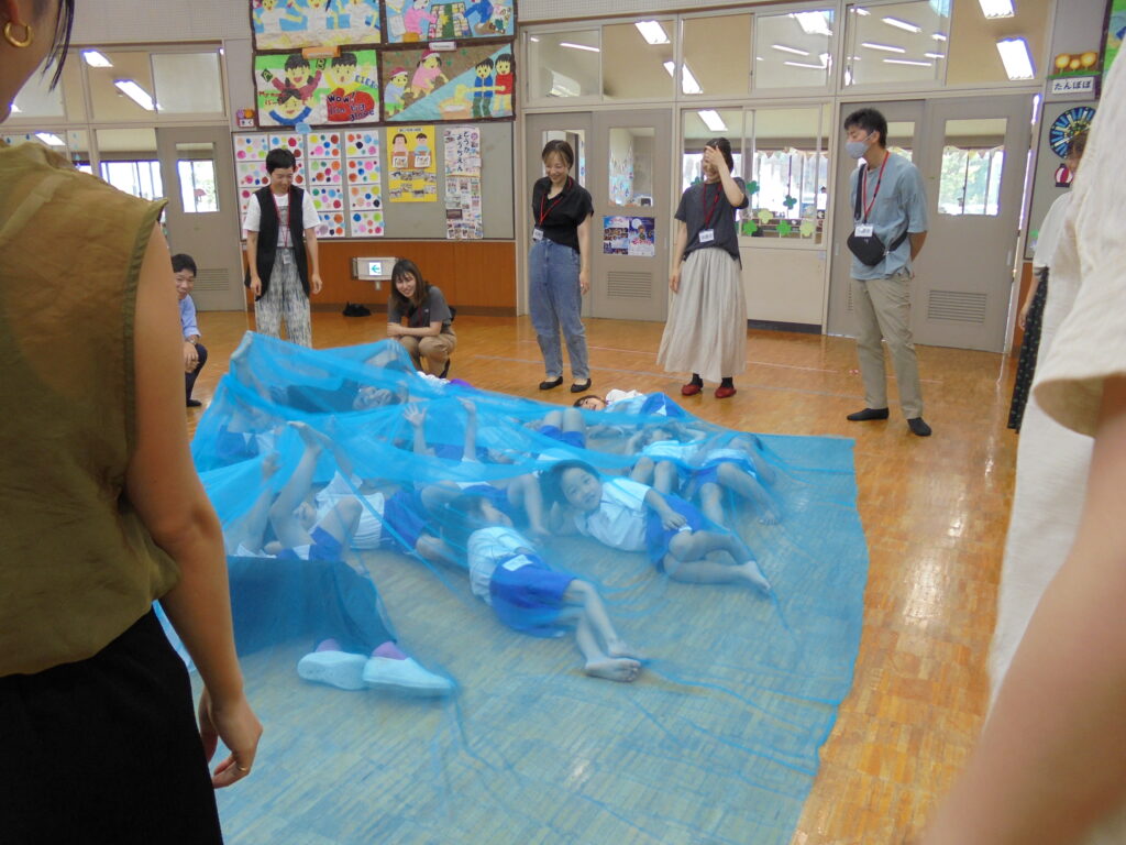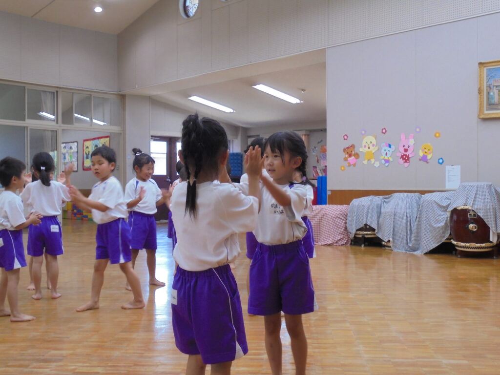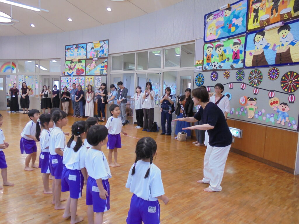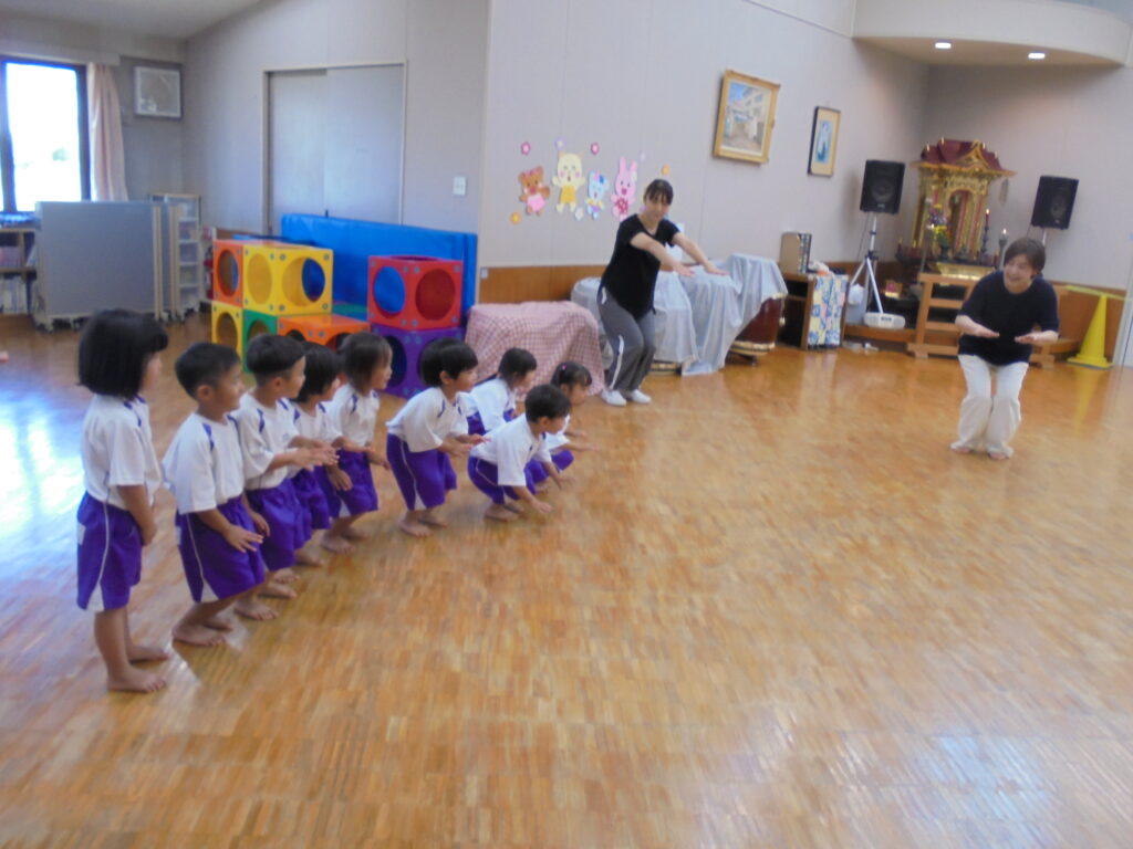 えんだより 2024.07.11 7月「リトミック教室」保護者に公開 7月5日(金)年少・年中・年長組の順でリトミック教室の公開をしました。 「海」をテーマとした動きとリズムを取り入れ、楽しく保護者と共にリトミック教室を展開してみました。ブルーやピンク、オレンジ色のカーテンを使った「海」「波」の音で子どもたちは思わず「へー!!すごい!本当の音みたい! すごい!すごい!」 「ママも海に入って、パパも入って」などと歓声を上げ、親子一つになり「海」を表現していました。