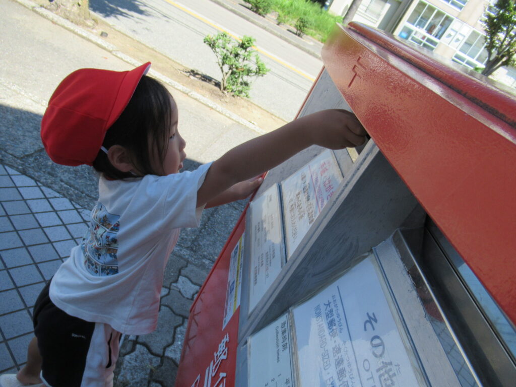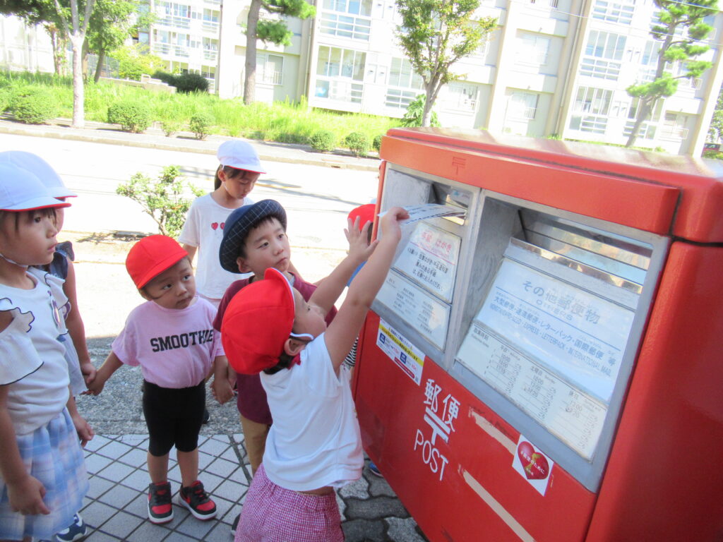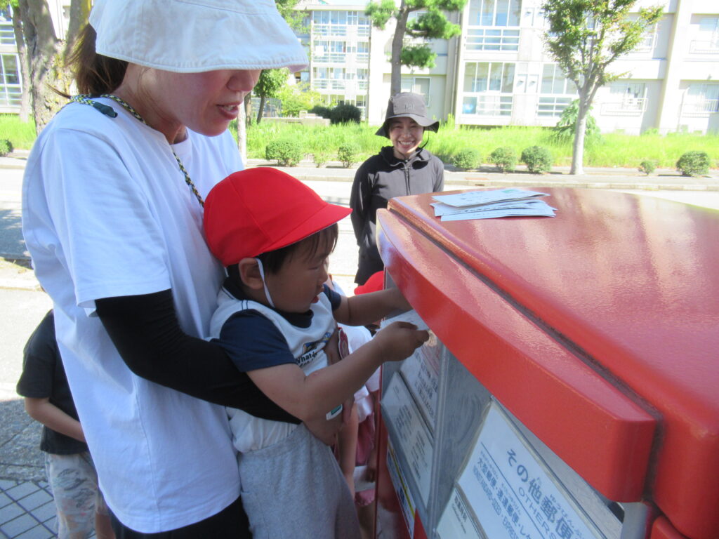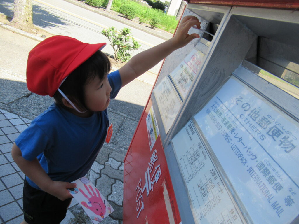 お知らせ 2024.09.13 9月10日(火) 「敬老の日」のハガキを入れてきました。 全園児がおじいちゃん、おばあちゃんに「敬老の日」に合わせて感謝の気持ちをハガキに書いてみんなで投函してきました。「ポストまで手がとどかないー」の声に年長組さんは優しく小さい子をだっこして投函させていました。