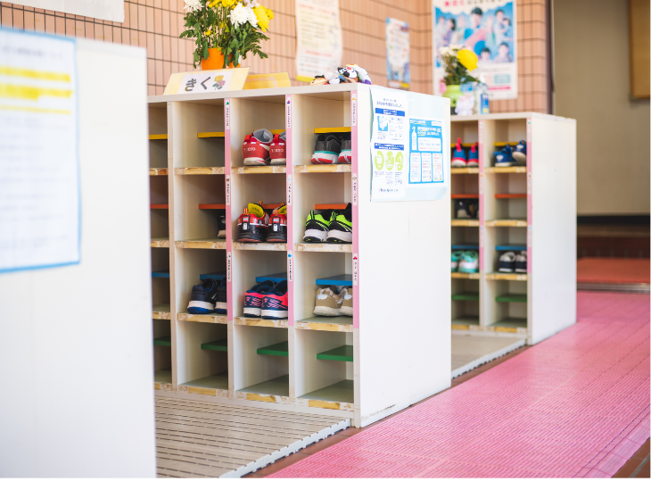 「おはようございます」「さようなら」のあいさつが飛びかう玄関。ここから裸足保育になります。