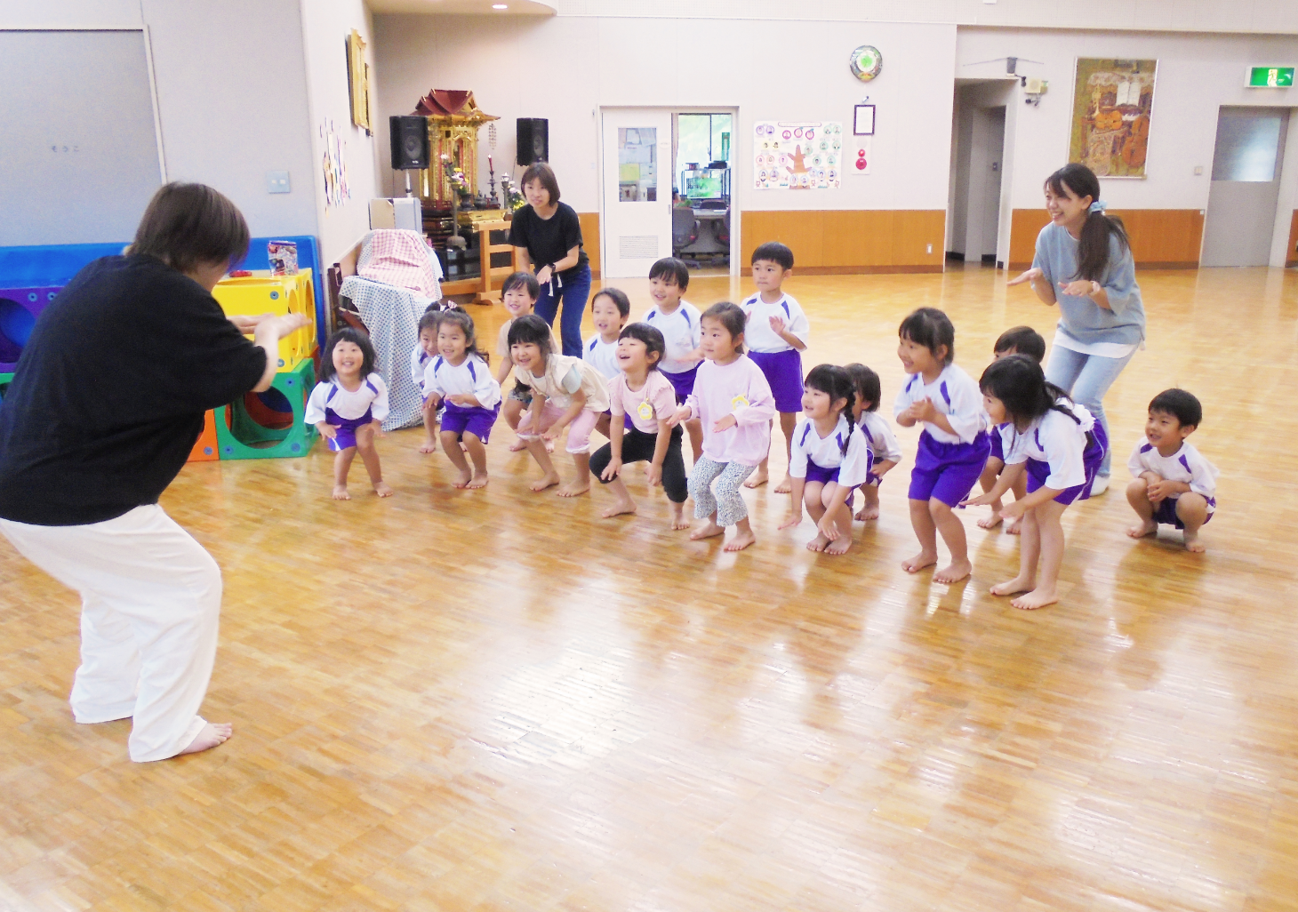 本幼稚園は大正11年に開園した歴史と伝統のある幼稚園です。浄土真宗の教えを元に、「ありがとう」の感謝の心を育てる教育を実践しています。浄土真宗の教えの一つに「和顔愛語(わげんあいご)」という言葉があります。「おだやかな顔とやさしい言葉」を意味していますが、いつもこのことを心して保育活動に努めています。そしてそこから生まれる園児たちの笑顔を何よりも大切にしています。笑顔は園児たちが健やかに成長していることを知る大切な指標であると考えるからです。ところが近年、小学校に行くとこの笑顔が消えてしまう子どもたちが増えているといいます。「小1プロブレム」というのだそうです。卒園式での「もうすぐ1年生になれる」との希望に溢れる園児の表情を思い浮かべると胸が痛みます。小学校の先生に伺うと学習活動に上手く順応出来ないことが原因であるようです。様々な遊びを通しての学びと共に本園では就学時前教育にもしっかりと取り組んでいます。「そろばん」「英会話」「サッカー」「和太鼓」「リトミック」「新体操」、本園独自のカリキュラムで円滑な小学校への進学を支援します。明るく元気で、笑顔溢れる学びの継続を心より願っています。