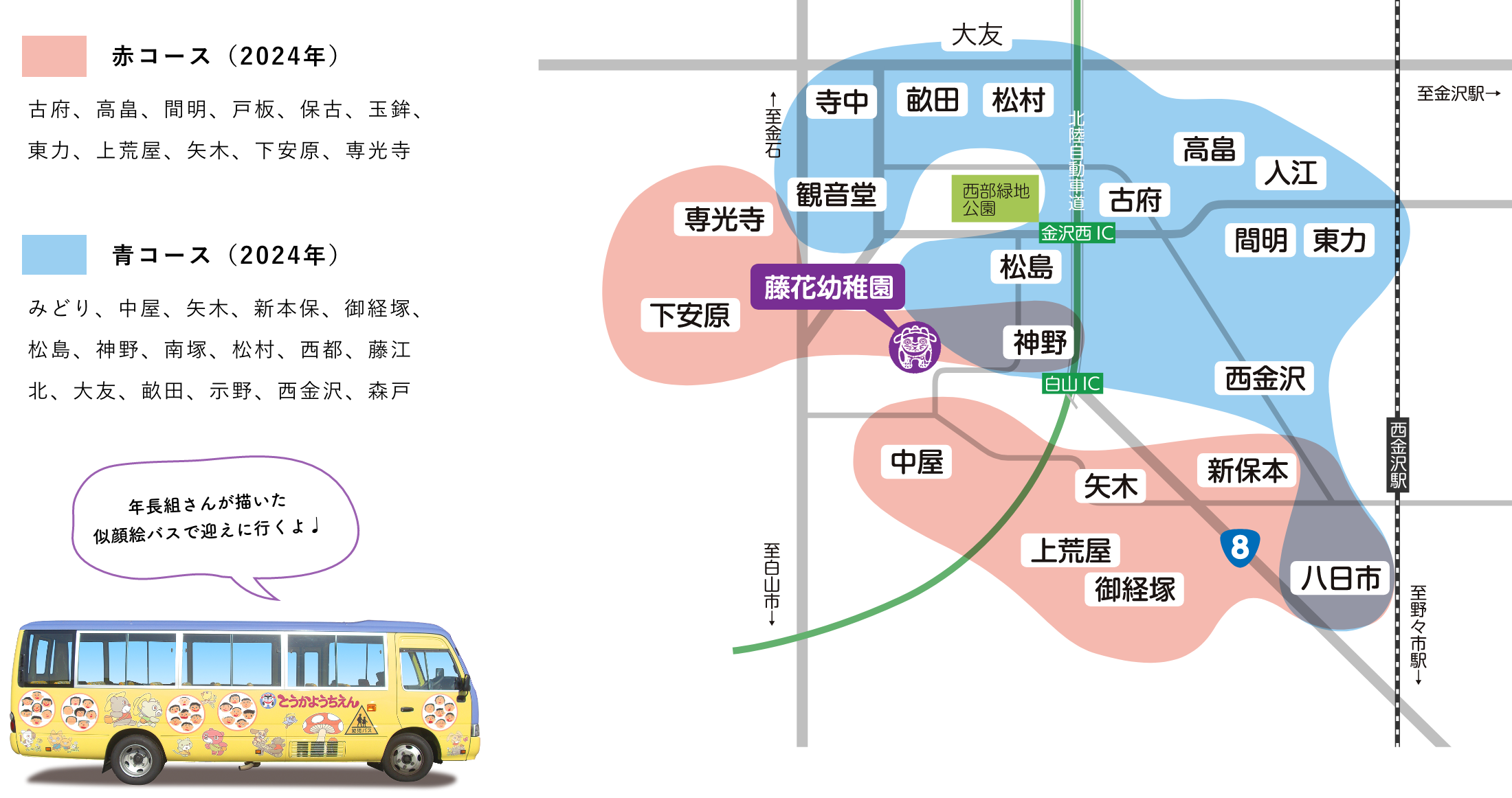 広域までスクールバスを運行しています。コースは令和6年度のものです。
